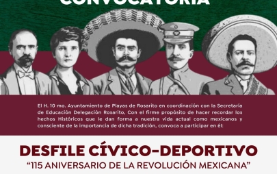 Playas de Rosarito, B.C., 11 de noviembre de 2025.-El 10° Ayuntamiento de Playas de Rosarito, en coordinación con la Secretaría de Educación, Delegación Rosarito, invita a instituciones educativas, dependencias gubernamentales y paramunicipales, asociaciones civiles, grupos deportivos y a la ciudadanía en general a participar en el Desfile Cívico-Deportivo con motivo del 115 Aniversario de la Revolución Mexicana, que se llevará a cabo el jueves 20 de noviembre, a partir de las 09:00 horas, iniciando a la altura de Vips Cantamar, en la Delegación Primo Tapia.