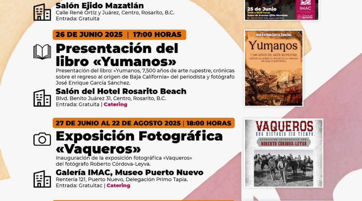 El 26 de junio, a las 17:00 horas, en el Salón del Hotel Rosarito Beach, se llevará a cabo la presentación del libro “Yumanos”, obra del periodista y fotógrafo José Enrique García Sánchez sobre los pueblos originarios de Baja California y el arte rupestre. La cartelera también incluye la exposición fotográfica “Vaqueros” del fotógrafo Roberto Córdova Leyva, del 27 de junio al 22 de agosto, en la Galería IMAC del Museo Puerto Nuevo.