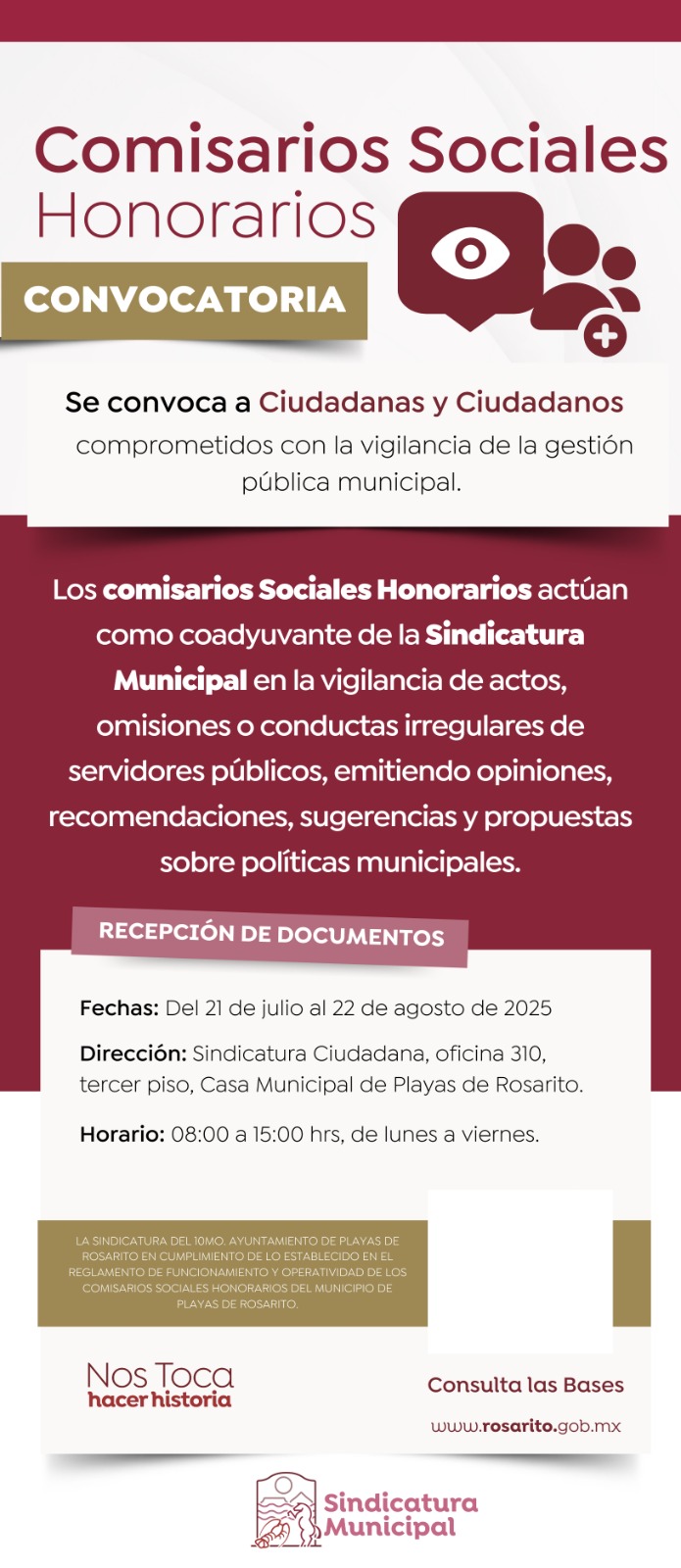 Playas de Rosarito, Baja California, a 15 de julio de 2025.- En cumplimiento a lo establecido en el Reglamento de Funcionamiento y Operatividad de los Comisarios Sociales del Municipio de Playas de Rosarito, y por instrucción de la presidenta municipal Rocio Adame, la Sindicatura Municipal del 10° Ayuntamiento invita a la ciudadanía a participar en la Segunda Convocatoria para formar parte del cuerpo de Comisarios Sociales Honorarios.