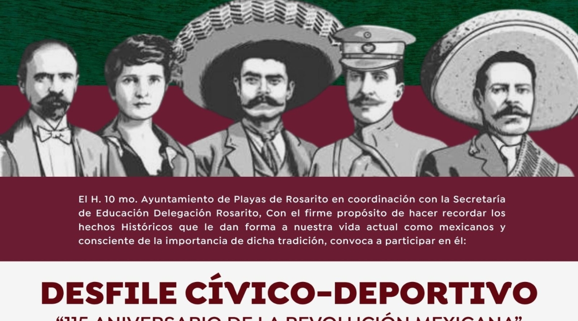 Playas de Rosarito, B.C., 11 de noviembre de 2025.-El 10° Ayuntamiento de Playas de Rosarito, en coordinación con la Secretaría de Educación, Delegación Rosarito, invita a instituciones educativas, dependencias gubernamentales y paramunicipales, asociaciones civiles, grupos deportivos y a la ciudadanía en general a participar en el Desfile Cívico-Deportivo con motivo del 115 Aniversario de la Revolución Mexicana, que se llevará a cabo el jueves 20 de noviembre, a partir de las 09:00 horas, iniciando a la altura de Vips Cantamar, en la Delegación Primo Tapia.