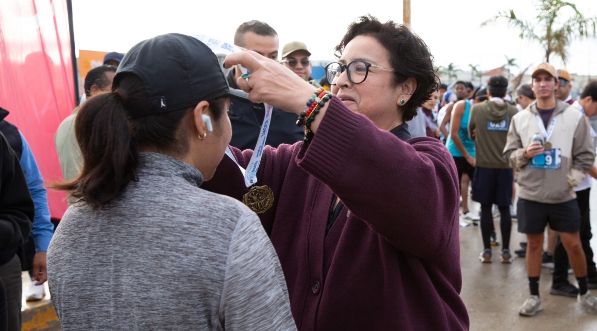 Como parte del evento, se realizó la entrega de medallas a las y los participantes conforme fueron cruzando la meta, y posteriormente, la Presidenta Municipal encabezó la entrega de bonos de 10 mil pesos como incentivo y reconocimiento a policías municipales que se distinguieron por su desempeño en diversas áreas clave como prevención, enlace, peritos y C5.