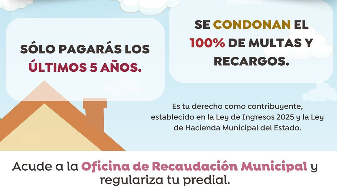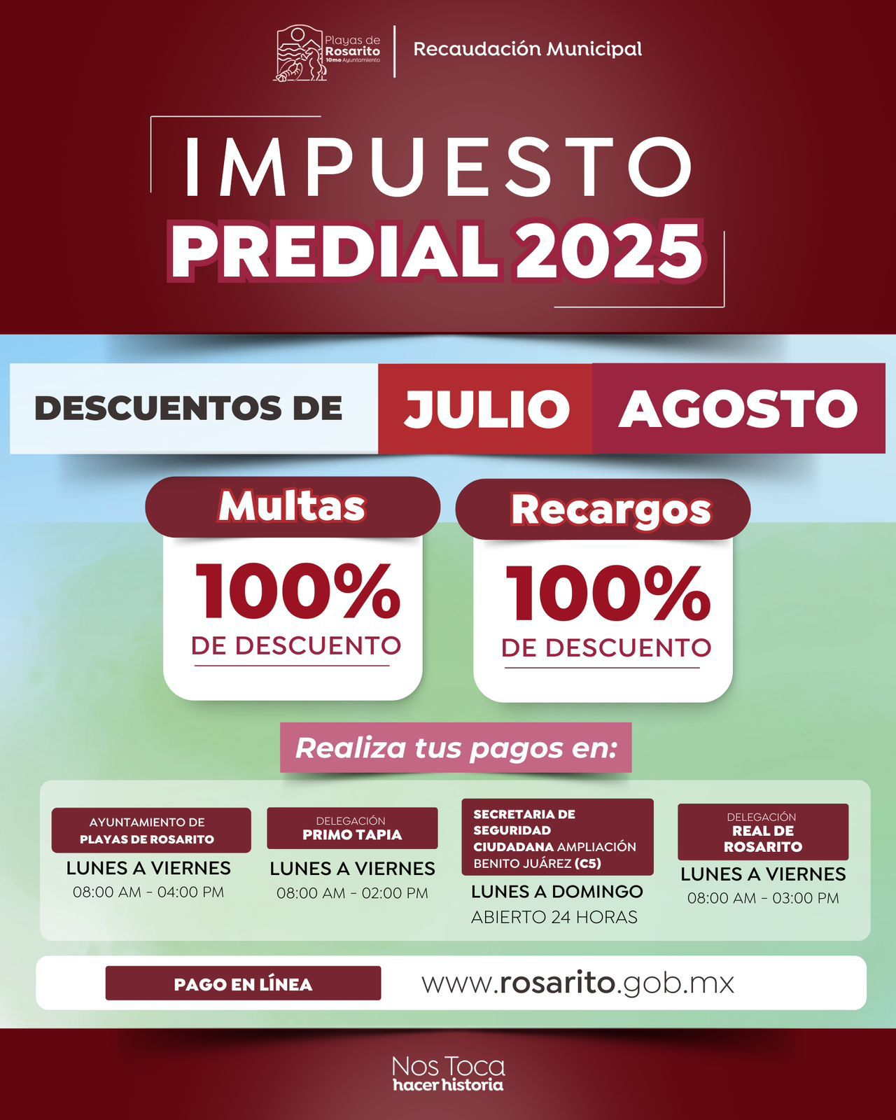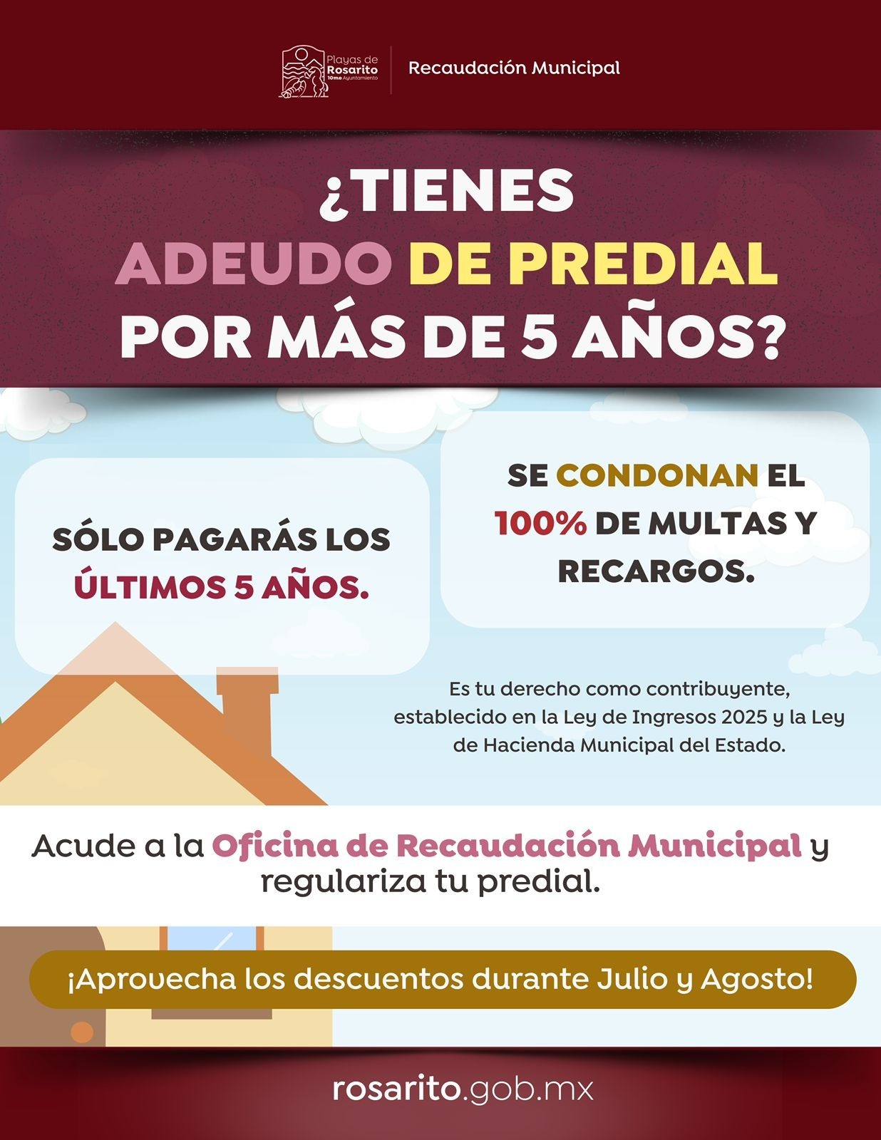 Durante todo julio y agosto se aplicará la condonación del 100% en multas y recargos generados por la omisión del pago del predial, y en caso de contar con adeudos mayores a cinco años, se realizará el ajuste correspondiente para que únicamente se cubran los últimos cinco años de deuda, conforme a lo establecido en el Artículo Quinto Transitorio de la Ley de Ingresos 2025 del Ayuntamiento de Playas de Rosarito.