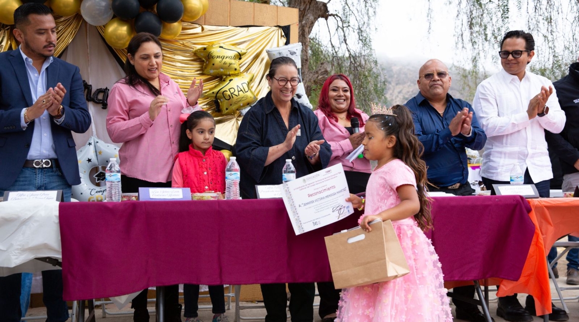 Playas de Rosarito, Baja California, 11 de julio de 2025.- En un emotivo acto celebrado en la Escuela Comunitaria Rural de El Morro, la alcaldesa de Playas de Rosarito, Mtra. Rocio Adame Muñoz, encabezó la ceremonia de graduación de los niveles preescolar, primaria y secundaria, donde niñas, niños y jóvenes celebraron el cierre de un ciclo escolar más.