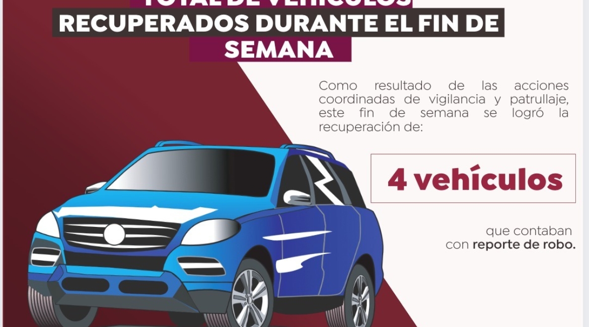 Playas de Rosarito, Baja California, 14 de julio de 2025. — Gracias a las labores de vigilancia, patrullaje y atención inmediata realizadas por elementos de la Secretaría de Seguridad Ciudadana, durante este fin de semana se logró la recuperación de cuatro vehículos con reporte de robo, fortaleciendo las acciones de prevención del delito que impulsa el Gobierno Municipal de Playas de Rosarito.