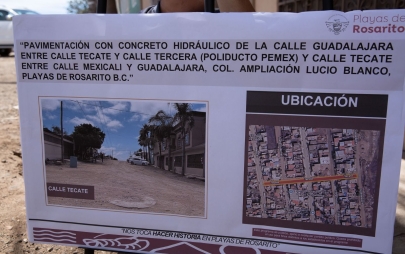 Playas de Rosarito, Baja California, 24 de julio de 2025.- La presidenta municipal de Playas de Rosarito, Mtra. Rocio Adame, encabezó el arranque de la obra de pavimentación con concreto hidráulico en la calle Guadalajara, entre las calles Tecate y Tercera (Poliducto Pemex), y la calle Tecate entre Mexicali y Guadalajara, en la colonia Ampliación Lucio Blanco.