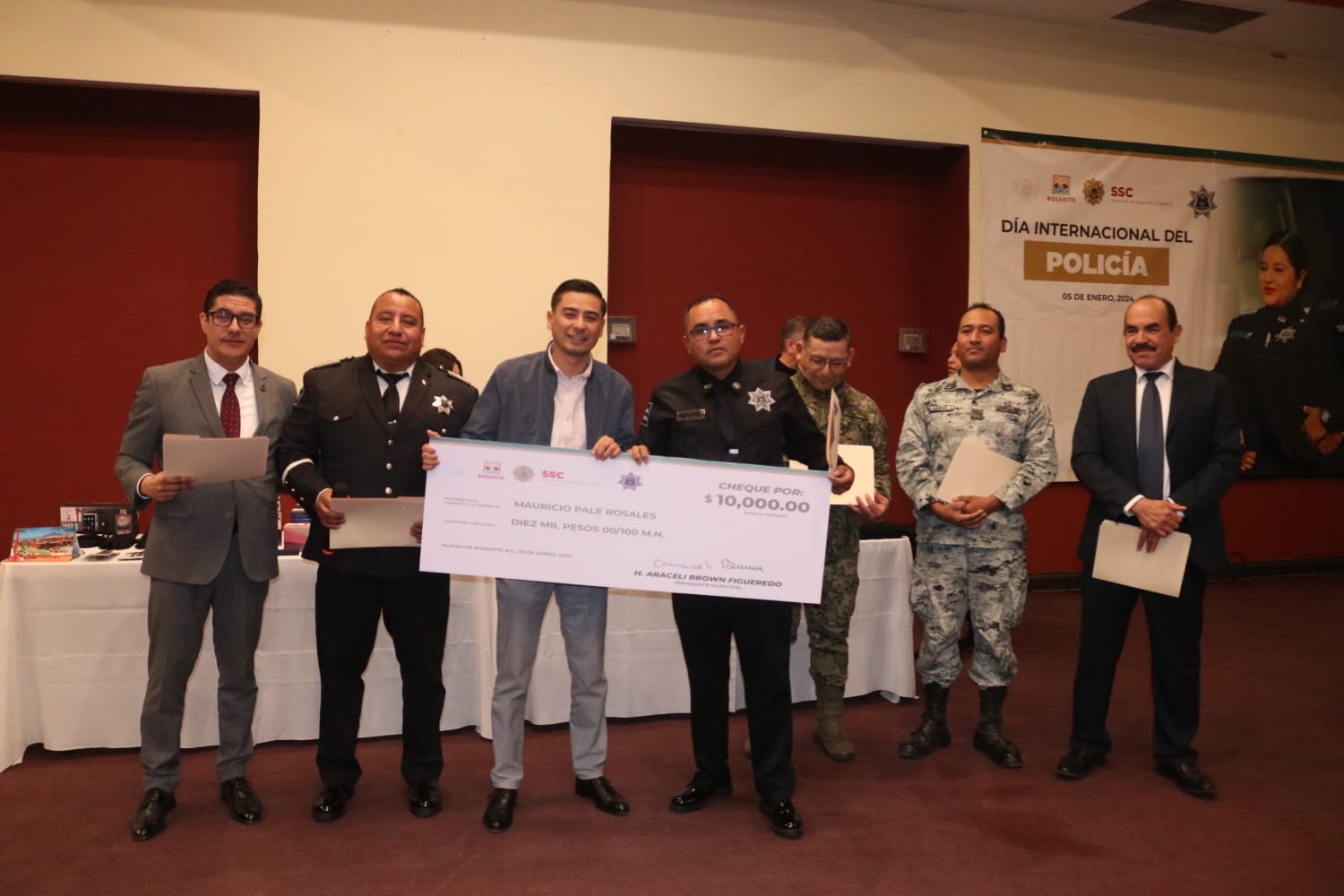 Playas de Rosarito, B.C. 5 de enero de 2024.- El Gobierno de la Ciudad, reconoció la destacada labor y desempeño de 15 policías de la Secretaría de Seguridad Ciudadana (SSC), con la entrega de cheques con un valor de 10 mil pesos cada uno, como parte de las actividades del Día Internacional del Policía.