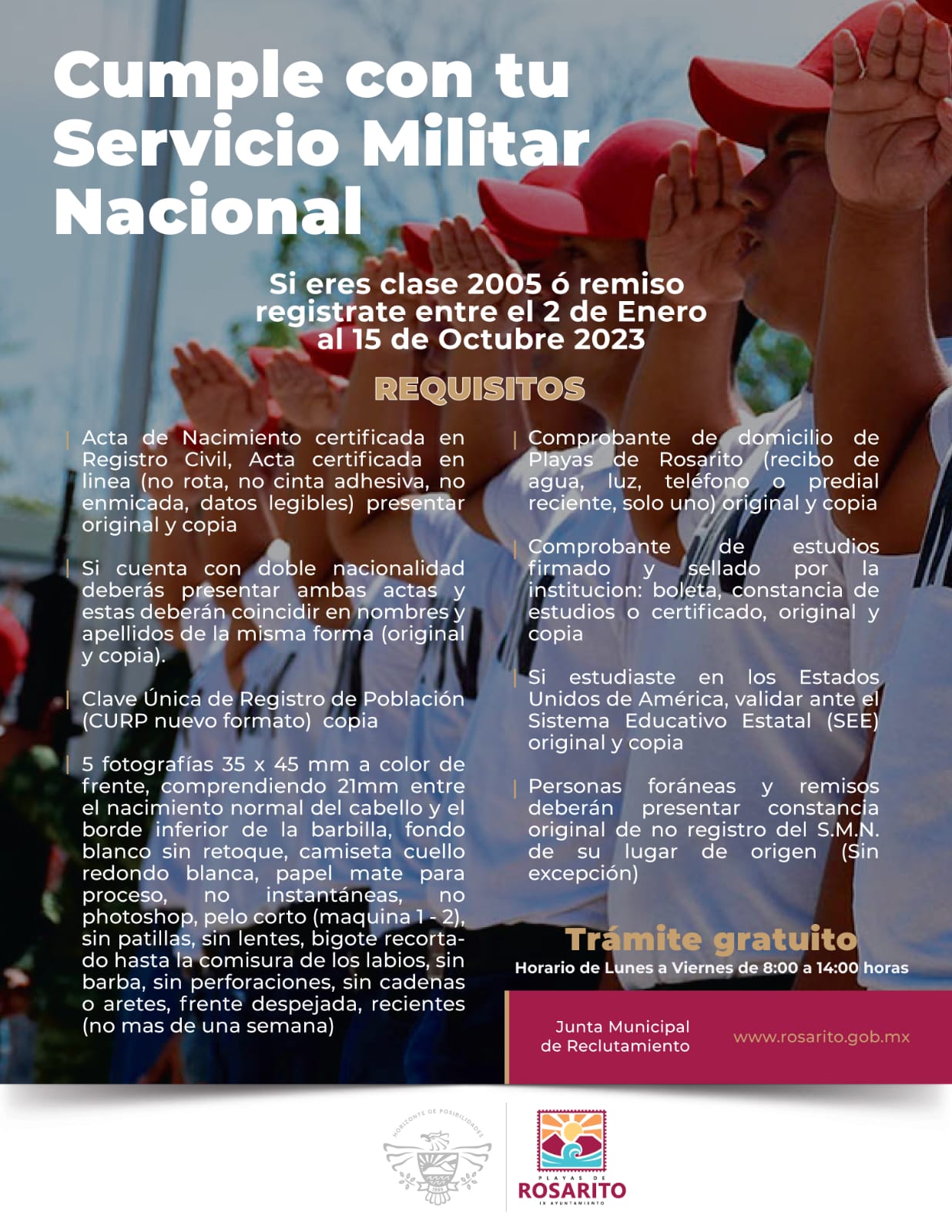 Playas de Rosarito, BC; a 10 de enero de 2023.- A fin de cumplir en tiempo con la obligación ciudadana constitucional estipulada para todos los mexicanos, nacidos o naturalizados, el IX Ayuntamiento de Playas de Rosarito, que encabeza la presidente Araceli Brown Figueredo, convoca a los jóvenes clase 2005 o remisos a cumplir en tiempo con su Servicio Militar Nacional.