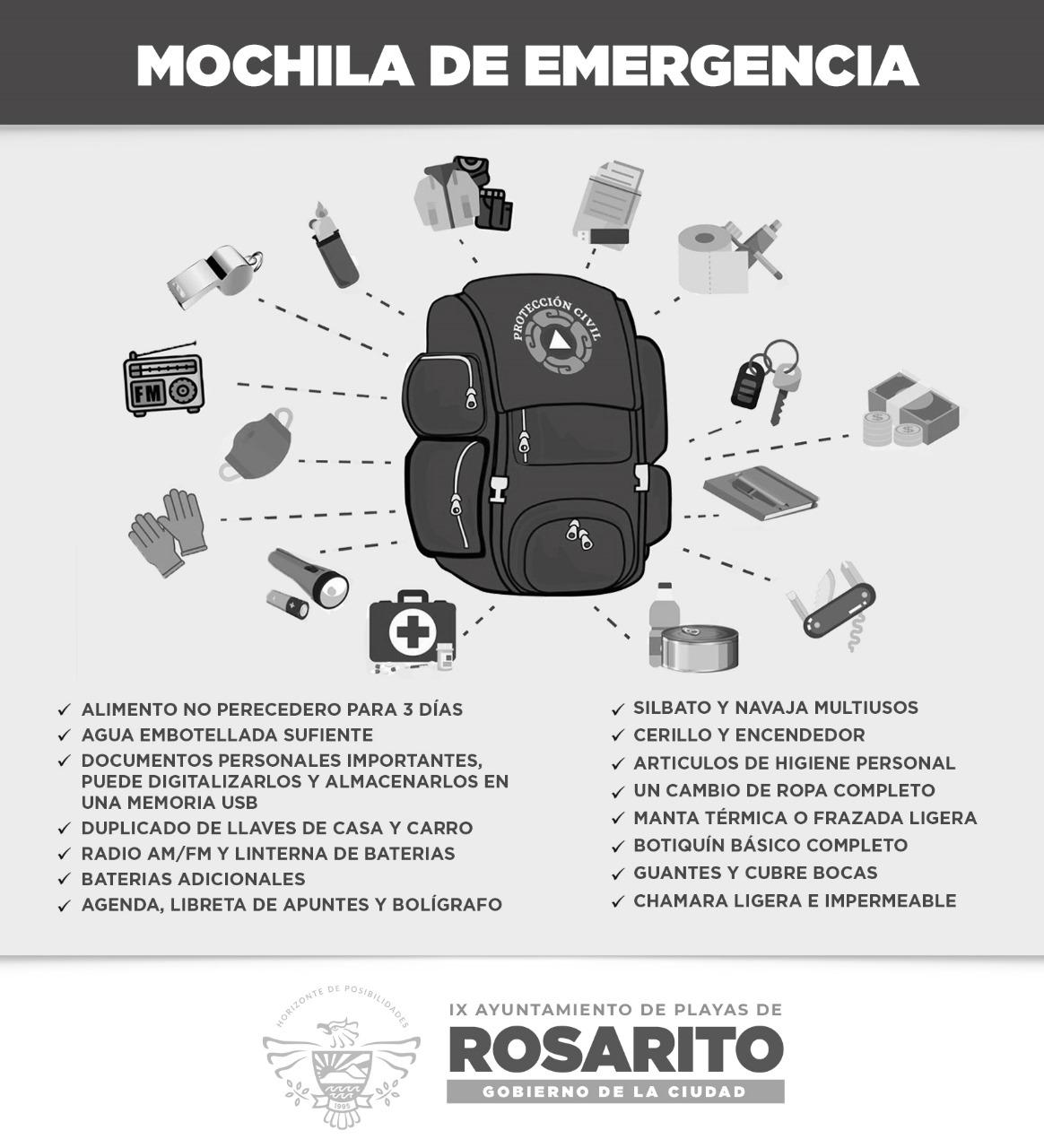 Playas de Rosarito, B.C. 9 de marzo de 2024.- Con la finalidad de estar preparados ante cualquier eventualidad que se presente, la actual administración municipal, recomienda a las y los rosaritenses, contar con una mochila de emergencias que se encuentre en algún lugar visible y al alcance de toda la familia, en caso de algún desastre natural o algún otro tipo de contratiempo.