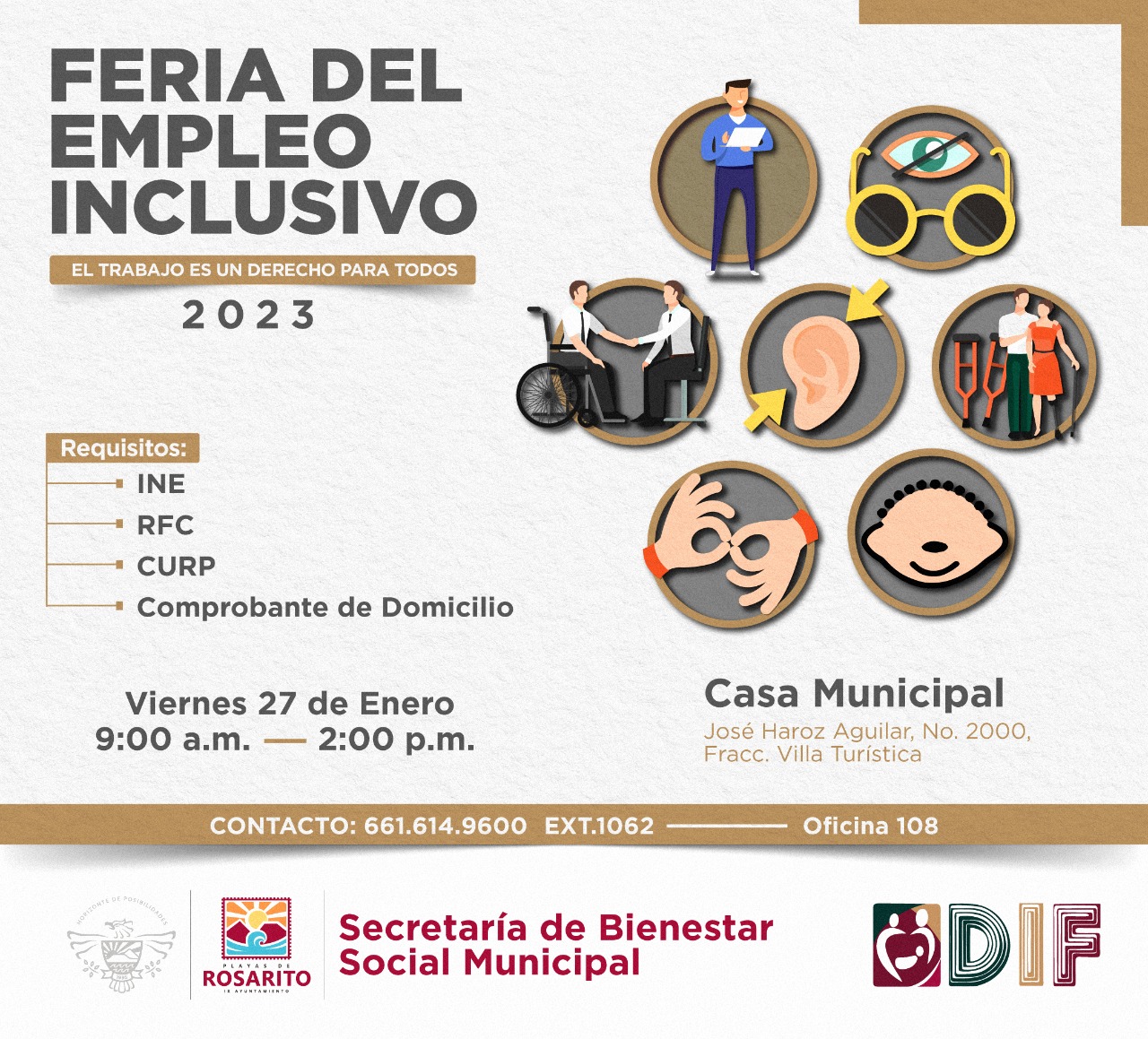 Playas de Rosarito, B.C. a 23 de enero del 2023.- El IX Ayuntamiento de Playas de Rosarito, invita a las y los residentes del Quinto Municipio a participar en la Primera Feria del Empleo Inclusiva de este 2023; el proyecto tiene como objetivo acercar las opciones de trabajo a quienes viven en esta ciudad, a fin de apoyarlos en su crecimiento profesional y personal; a la par de fortalecer las relaciones laborales con los distintos sectores de la localidad.