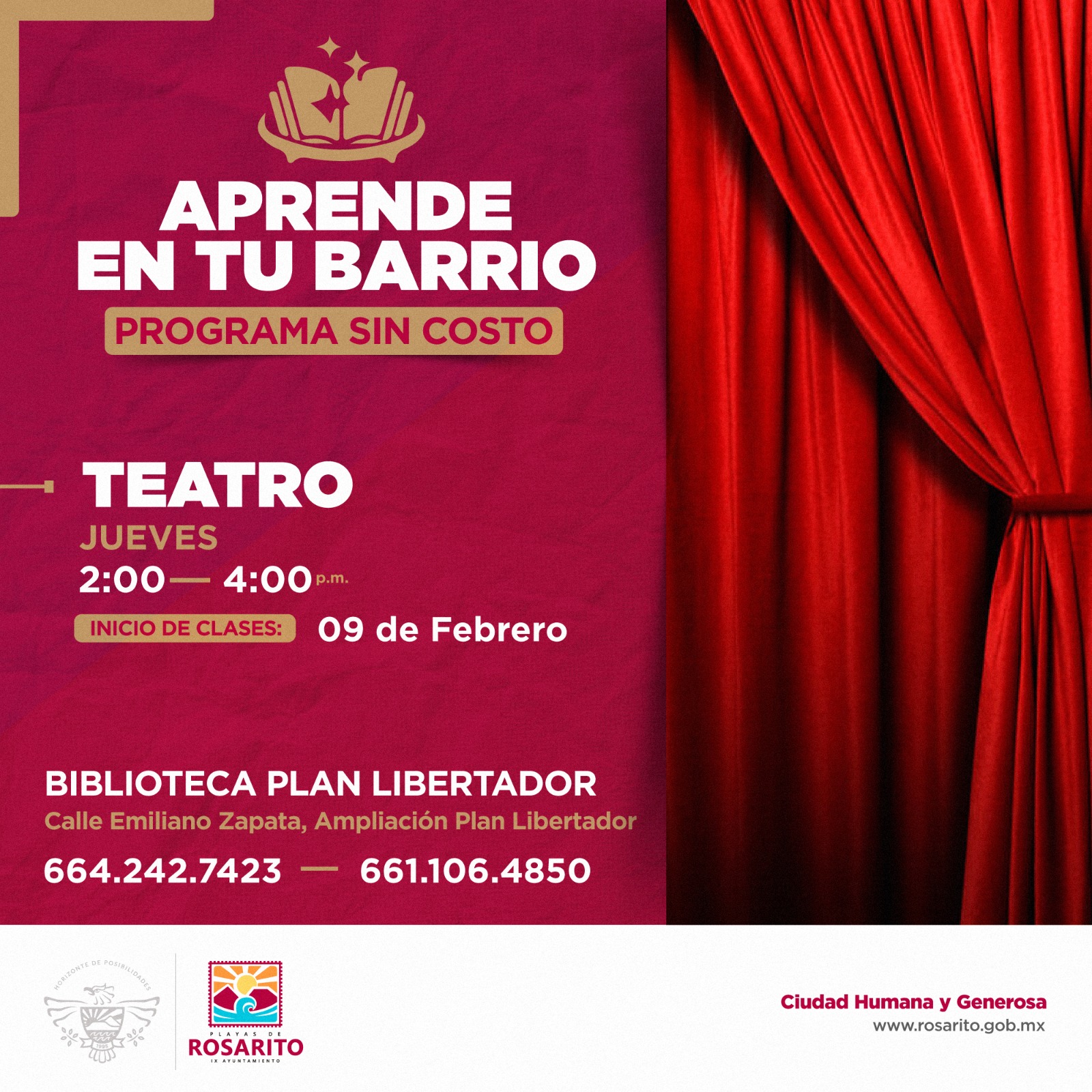 Por último, el día jueves 9 de febrero, iniciarán las clases de teatro gratuitas en las instalaciones de la Biblioteca Plan Libertador, ubicada en la calle Emiliano Zapata, de la colonia Ampliación Libertador. Las clases se impartirán de 2:00 a 4:00 pm; para inscribirse pueden comunicarse al número 664 242 74 23.