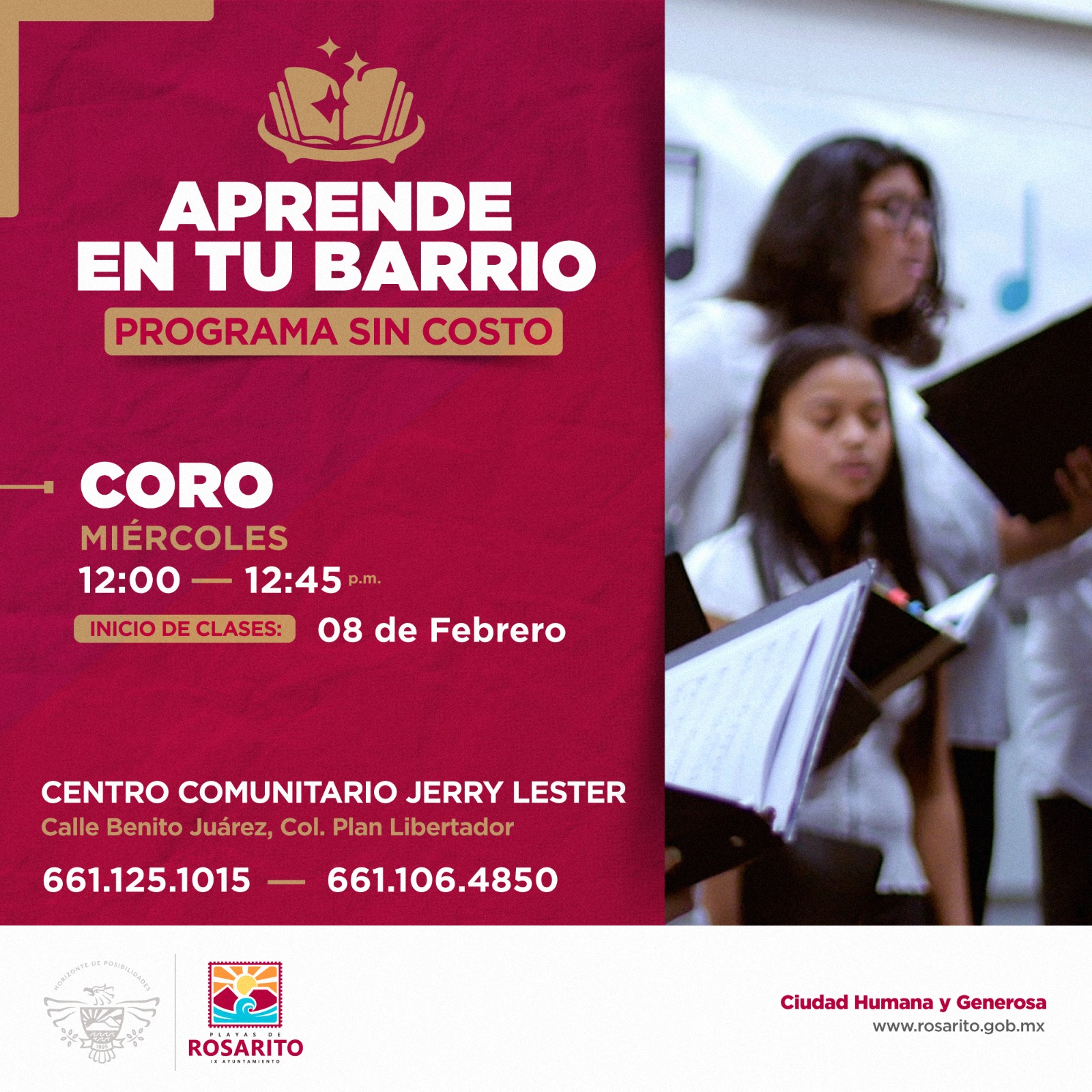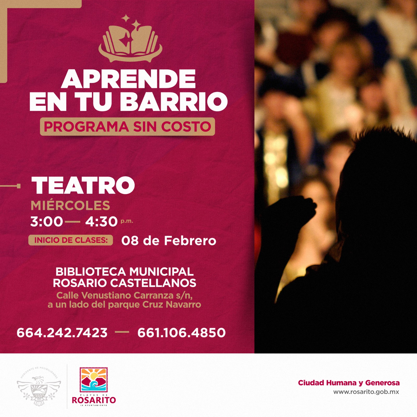 El día miércoles 8 de febrero, iniciarán los talleres de teatro, en la biblioteca municipal Rosario Castellanos, los días miércoles, de 3:00 a 4:30 pm. Quienes deseen inscribirse a este taller gratuito pueden comunicarse al número 664 242 74 23. Otro taller que inicia el mismo miércoles son las clases de coro en el Centro Comunitario Jerry Lester, de 12:00 a 12:45 pm. Los interesados en el taller se coro se pueden inscribir llamando al de teléfono 661 125 10 15.