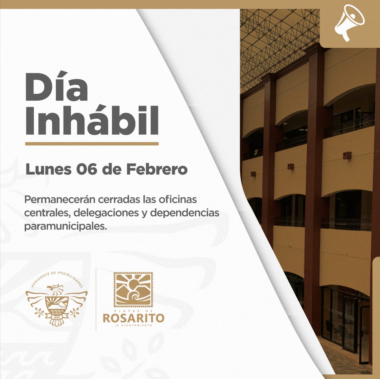 Playas de Rosarito, B.C. a 3 de febrero de 2023.- El IX Ayuntamiento de Playas de Rosarito, informa a la población que el próximo lunes 6 de febrero las oficinas de la Casa Municipal permanecerán cerradas, al ser considerado día inhábil para el Gobierno Municipal; reanudando actividades de manera habitual el martes 7 de febrero.