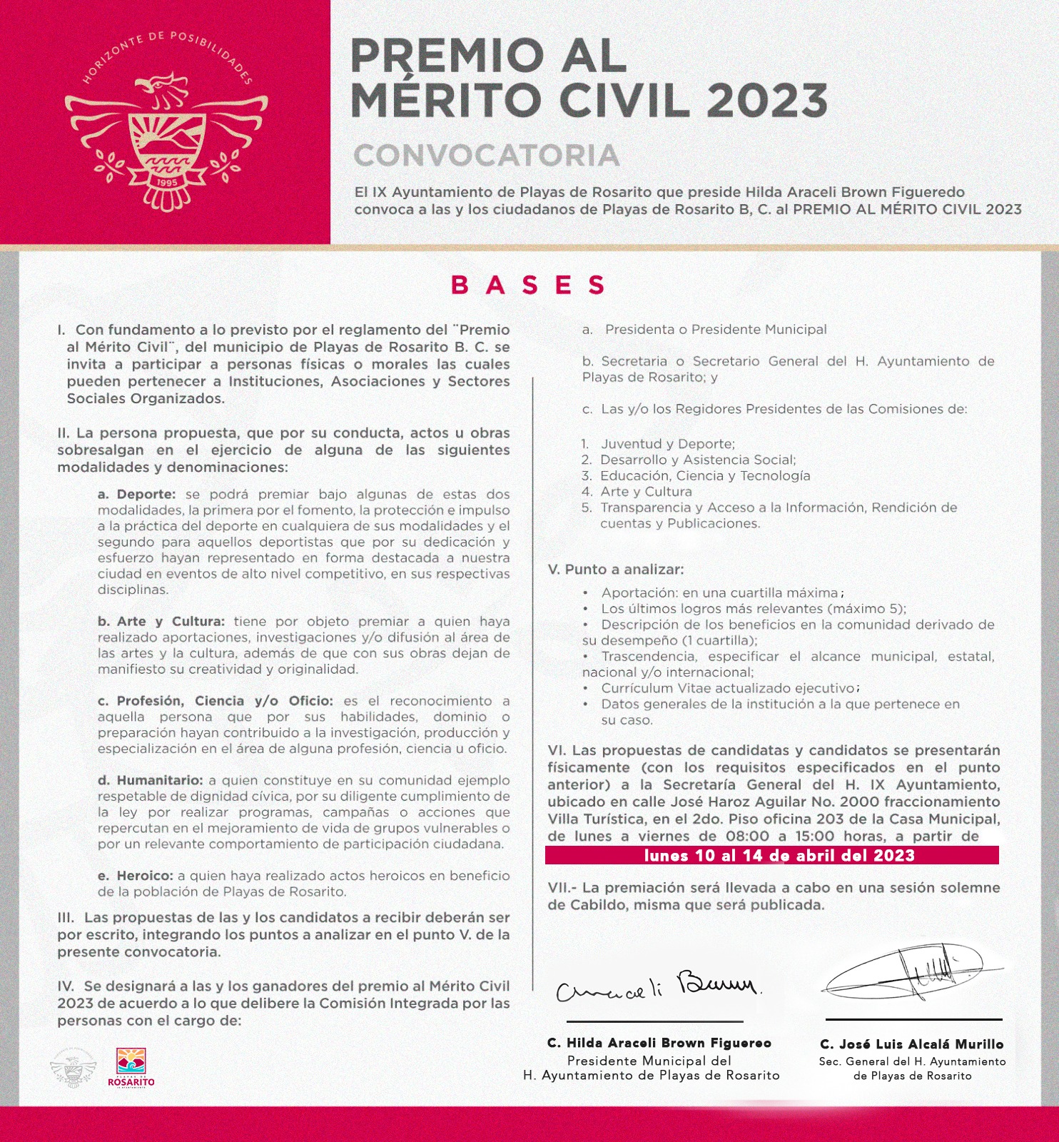 Playas de Rosarito, B.C. 09 de abril de 2023.- El IX Ayuntamiento de Playas de Rosarito a través de la Secretaría General de Gobierno, hace un llamado a las y los rosaritenses a proponer ciudadanos destacados para competir por el Premio al Mérito Civil 2023, informó la presidenta municipal, Araceli Brown Figueredo.