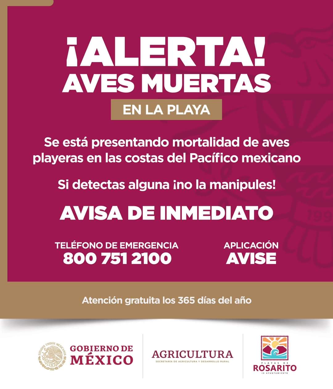 Figueroa Rubio, mencionó que la autoridad federal como la Comisión Nacional de Áreas Naturales Protegidas (Conanp), emitió una alerta indicando que se está presentando mortandad de aves en costas del Pacífico mexicano y pide que se reporte vía telefónica o a la aplicación AVISE.