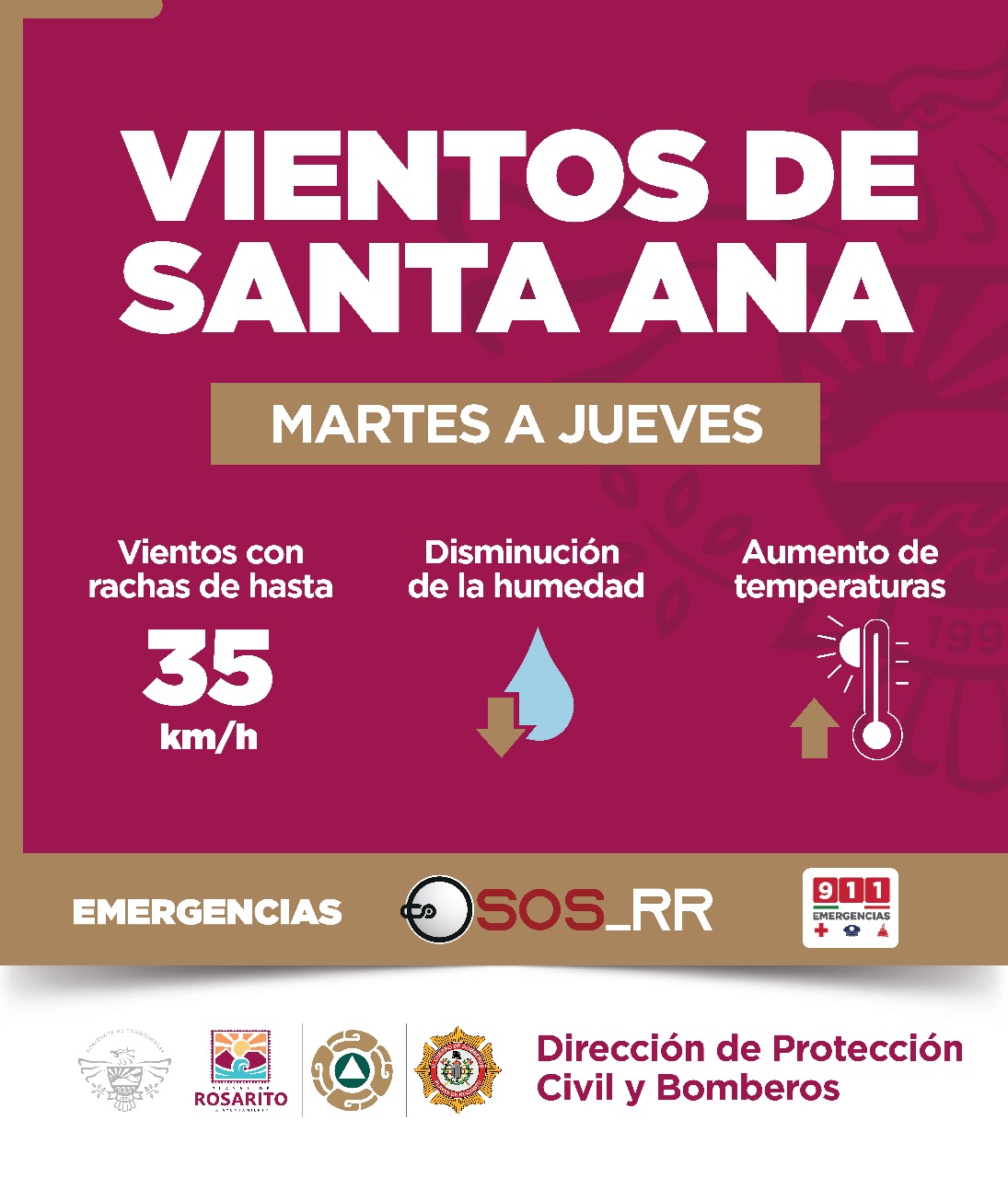 Playas de Rosarito, B.C. 3 de octubre de 2023.- El Gobierno de Rosarito, a través de la Secretaría de Seguridad Ciudadana y la Dirección de Protección Civil y Bomberos, informa que se prevé condición Santa Ana, desde este martes hasta el jueves 5 de octubre, con rachas de vientos de hasta 35 kilómetros por hora, además de probabilidades de aumento de temperatura.