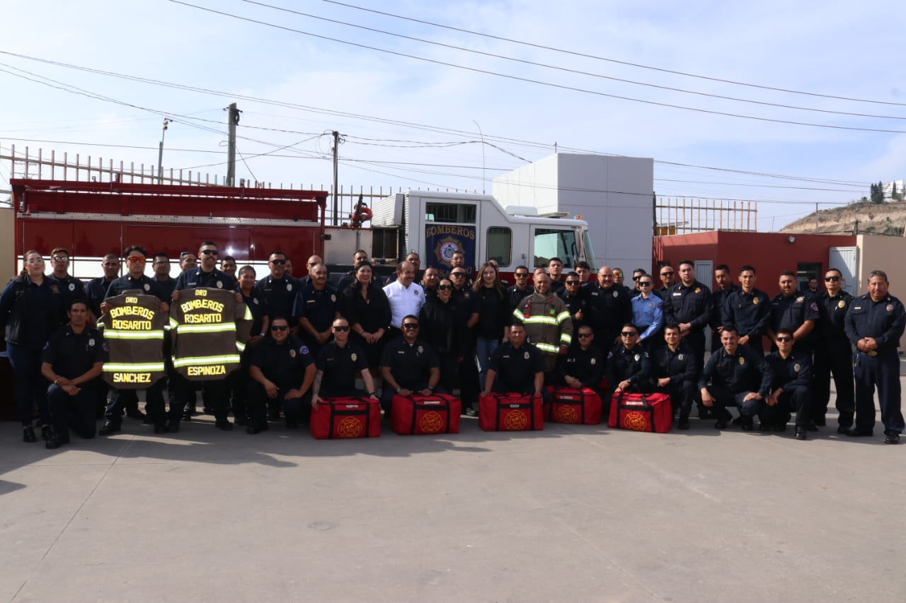 “Actualmente el personal trabaja más unido y seguro por la comunidad de Playas de Rosarito. Estos uniformes entregados son para combatir incendios en edificios o estructuras donde la temperatura puede ser muy elevada y constan de: guantes, botas, pantalón chaquetón y lámpara de mano”, indicó García Ames.