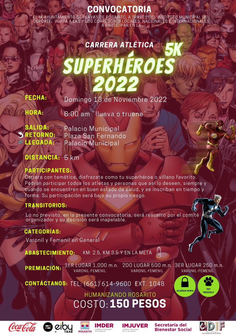 Playas de Rosarito, BC, a 12 de noviembre de 2022.- A fin de promover la actividad física, así como eventos recreativos familiares que beneficien la salud de las y los rosaritenses, la presidente municipal del IX Ayuntamiento de Playas de Rosarito, Araceli Brown Figueredo invita a la población a participar en la “Carrera Atlética 5K Superhéroes 2022”, misma que se llevará a cabo este domingo 13 de noviembre.