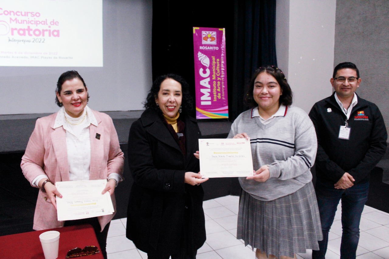 Playas de Rosarito, BC; a 6 de diciembre de 2022.- A fin de promover la participación de las y los jóvenes rosaritenses, en los programas que promueve el Gobierno de Playas de Rosarito, el IX Ayuntamiento llevó a cabo el “Concurso Municipal de Oratoria Interprepas 2022”, en el que la presidente municipal, Araceli Brown Figueredo, encabezó la entrega de reconocimientos a participantes y premiación a los tres primeros lugares.