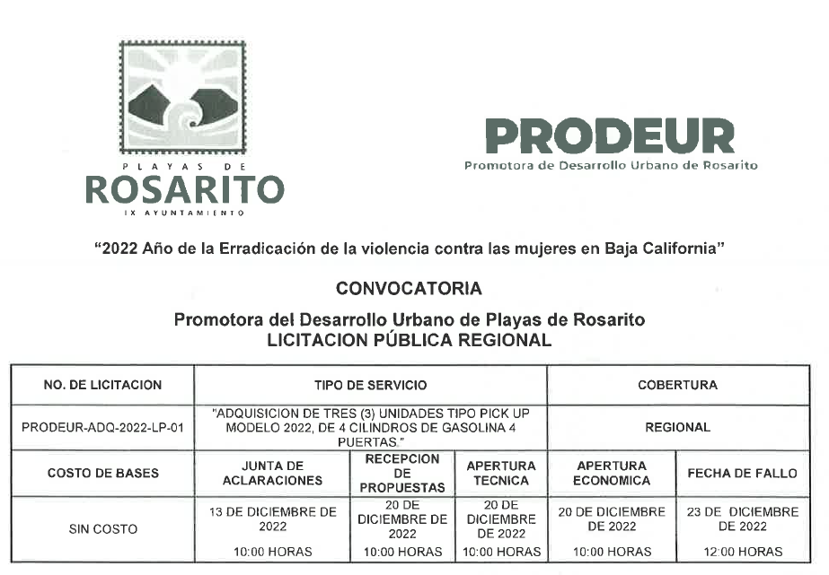 Las Bases para la Licitación así como las especificaciones técnicas de la adquisición estarán a la disposición de los interesados en las oficinas de la Promotora del Desarrollo Urbano de Playas de Rosarito, B.C., en Calle José Haroz Aguilar No. 2000, tercer piso, Oficina número 309, en el Fraccionamiento Villa Turística de la Ciudad de Playas de Rosarito Baja California, Código Postal 22706 a partir del día: 08 de diciembre del 2022 y hasta el día 13 de diciembre del 2022, en un horario de las 08:00 horas a las 15:00 horas del día.