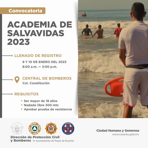 El registro se llevará a cabo los días lunes 9 y martes 10 de enero, de 8 AM a 3 PM, en la Central de Bomberos de Playas de Rosarito, ubicada en la colonia Constitución. Las y los interesados deberán aprobar una prueba de resistencia y nado libre de 300 metros, mismas que serán supervisadas por personal de la Dirección de Protección Civil y Bomberos.