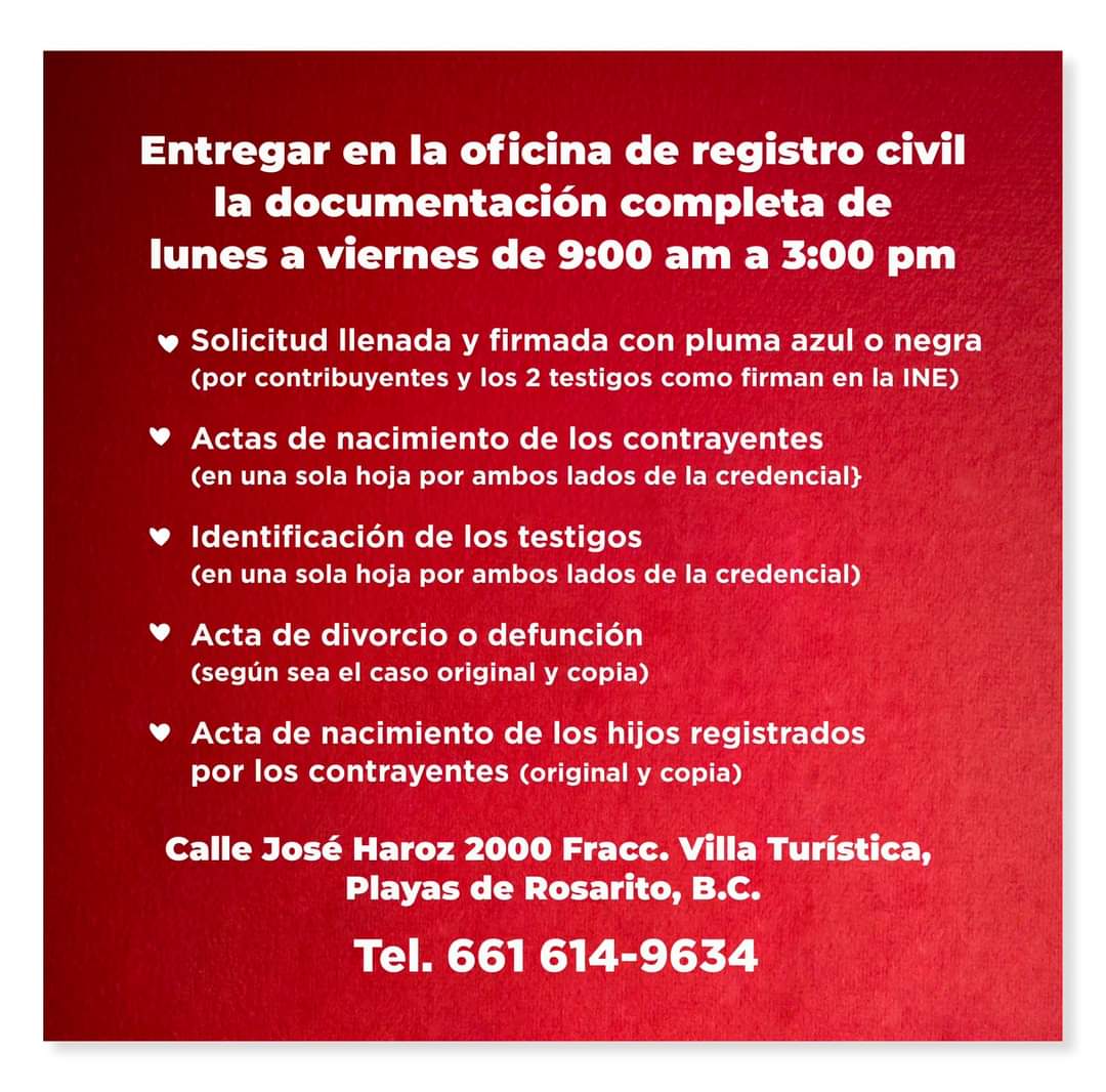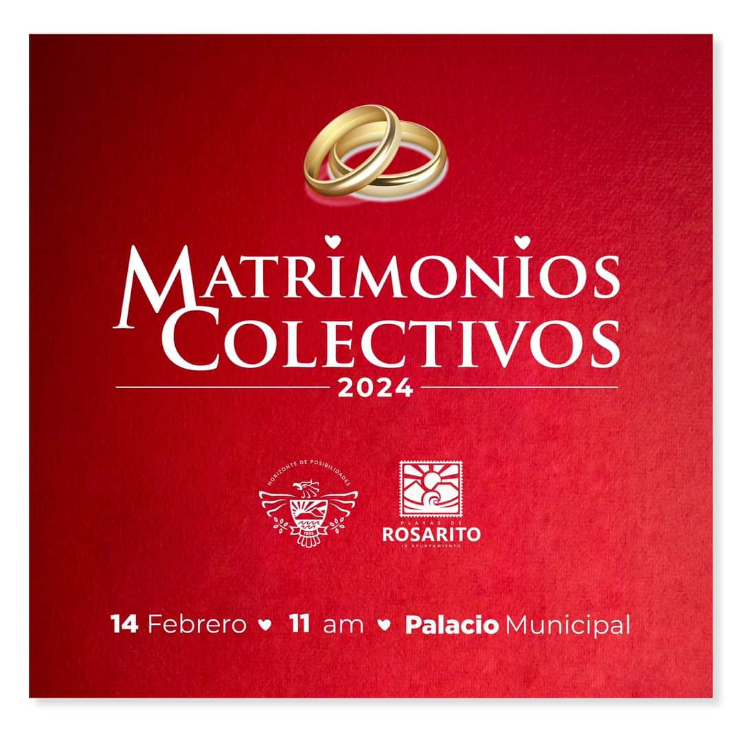Playas de Rosarito, B.C. 17 de enero de 2024.- El Gobierno Municipal a través de la Oficialía de Registro Civil, invita a las parejas que deseen contraer nupcias, de manera gratuita, a registrarse en la ceremonia de Matrimonios Colectivos “Cásate Conmigo", que se llevará a cabo el 14 de febrero en la Casa Municipal.