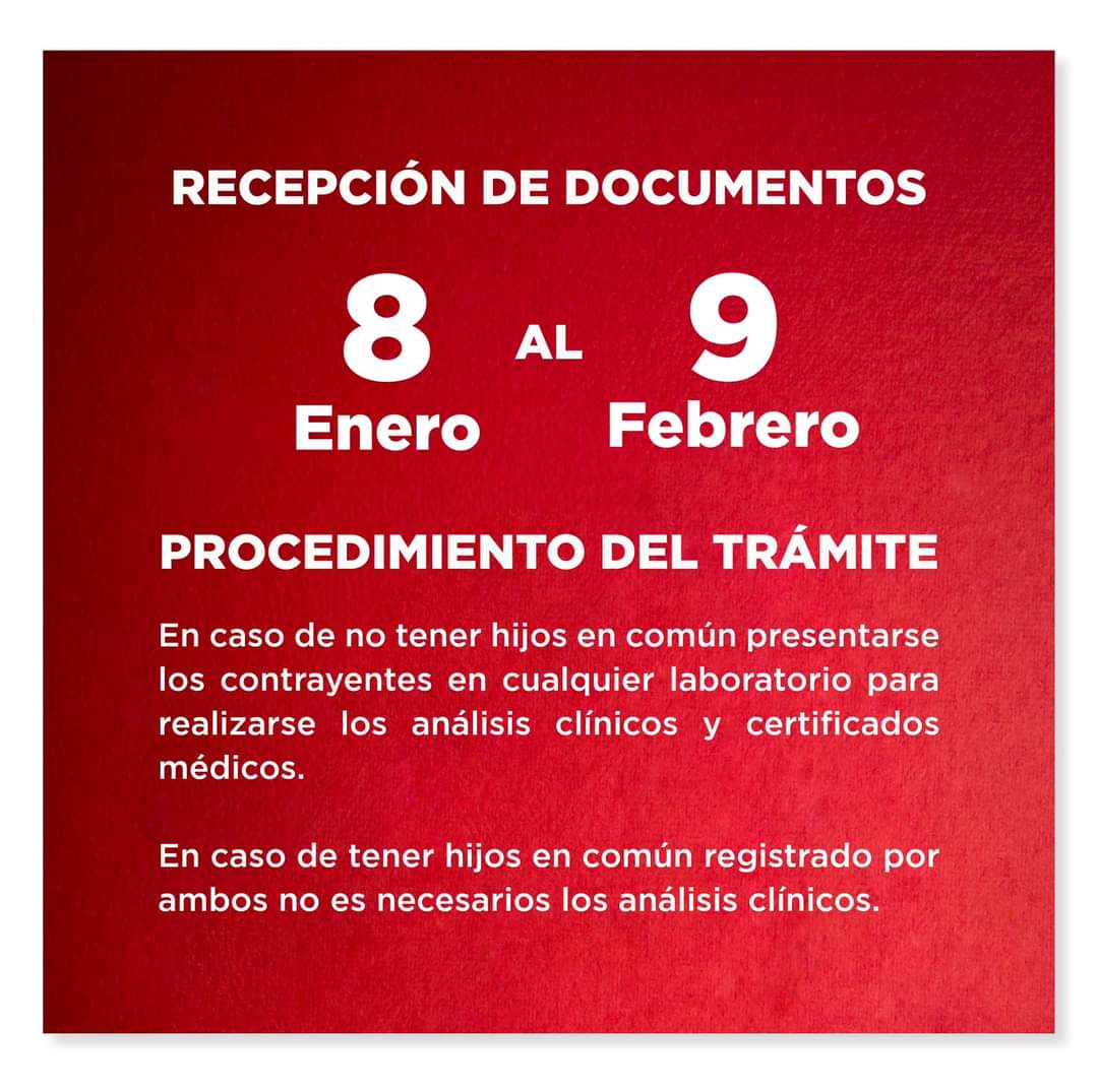 También deben llevar los resultados de análisis clínicos prenupciales y el certificado de pláticas prematrimoniales emitido por el Sistema para el Desarrollo Integral de la Familia (DIF). La recepción de documentación será en las oficinas de Registro Civil de la Casa Municipal, de lunes a viernes de 9:00 am a 3:00 pm, hasta el viernes 9 de febrero.