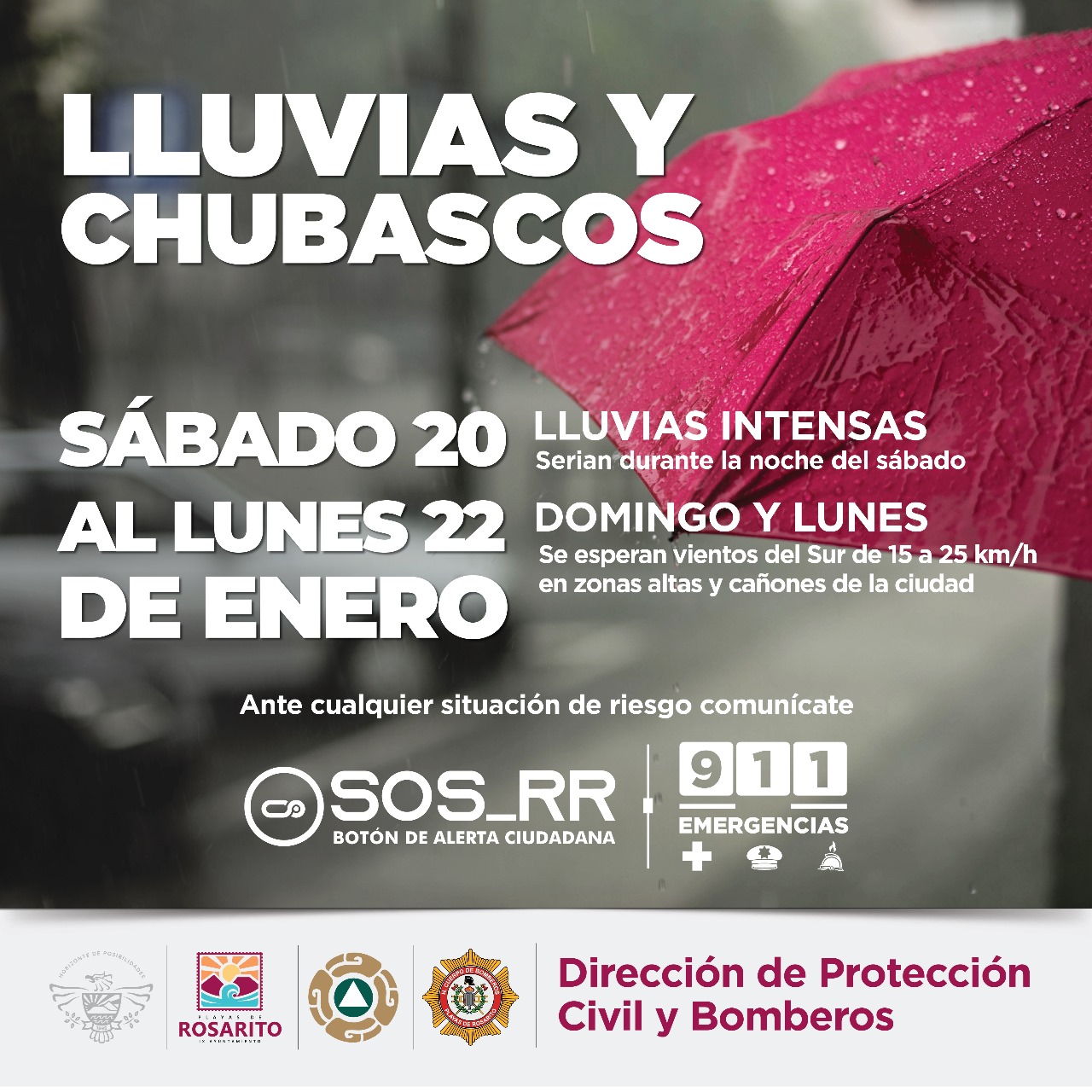 Playas de Rosarito, B.C. 19 de enero de 2024.- El Gobierno de la Ciudad informa que a partir de mañana sábado 20 y hasta el martes 22 de enero, se presentarán lluvias intensas y vientos en zonas altas, de acuerdo al Servicio Meteorológico Nacional, por lo que se exhorta a tomar medidas para evitar incidentes y prevenir complicaciones a la salud.