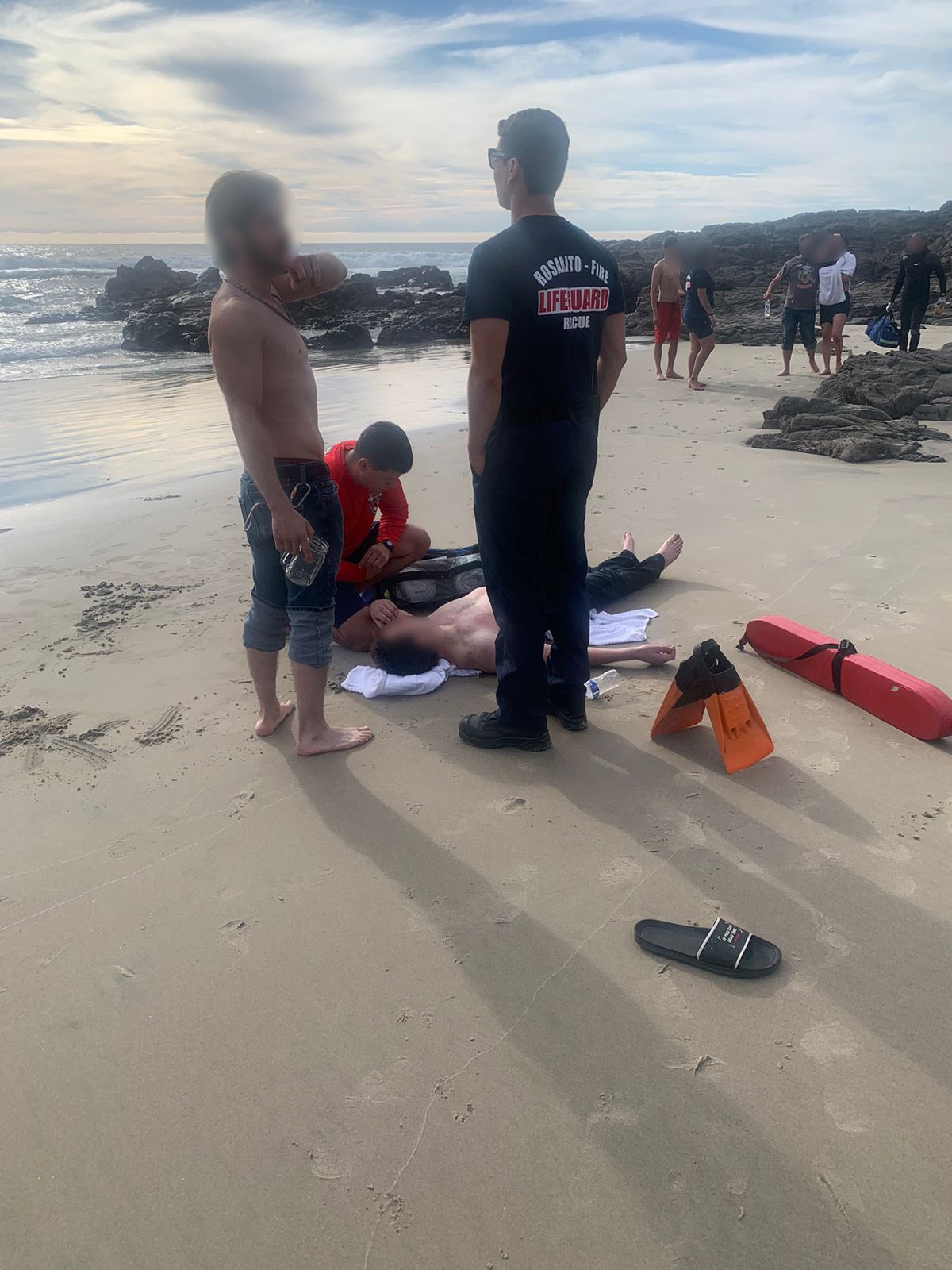 Playas de Rosarito, B.C. 19 de enero de 2024.- Personal de la División de Rescate Acuático de Playas de Rosarito, atendió a dos personas que fueron atrapadas por la corriente y las rocas, en las inmediaciones de un hotel de la zona sur del Quinto Municipio.