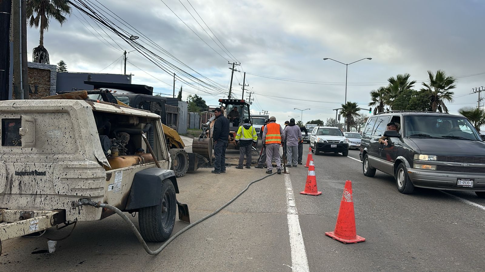 Playas de Rosarito, B.C. 25 de enero de 2024. El Gobierno de Araceli Brown Figueredo, informa a la ciudadanía, que fue cerrada a la circulación vehicular, un tramo del bulevar Benito Juárez, en su intersección con Hisense, debido a los trabajos de reparación de un hundimiento en la zona.