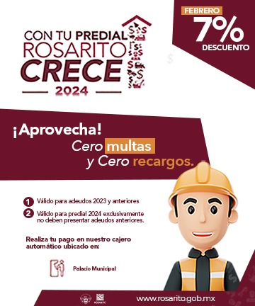 Playas de Rosarito, Baja California, B.C. 31 de enero de 2024.- A partir del mes de febrero, el Ayuntamiento de Rosarito, tendrá el siete por ciento de descuento en el pago del Impuesto Predial; así como cero multas y recargos, por lo que se hace un llamado a la ciudadanía a aprovechar tal beneficio, tal como lo ha manifestado la presidente municipal, Araceli Brown Figueredo.