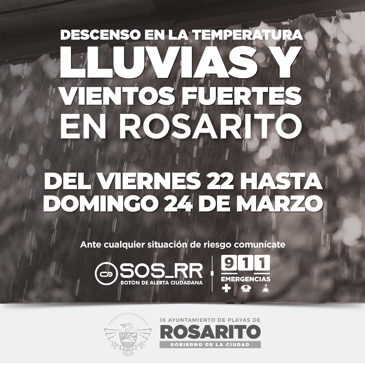Playas de Rosarito, BC., 21 de marzo de 2024. El Gobierno de la Ciudad informa a la comunidad que de acuerdo al pronóstico del Sistema Meteorológico Nacional (SMN), se espera un descenso en la temperatura, lluvias y vientos fuertes a partir del viernes 22 y hasta el domingo 24 del presente mes.