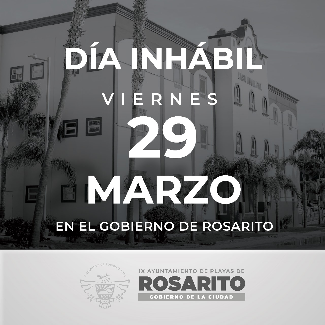 Playas de Rosarito, a 26 de marzo de 2024.-. El Gobierno de la Ciudad informa a la comunidad que el próximo viernes 29 de marzo, se suspenderán las actividades en las oficinas municipales para todo el personal de base y confianza.