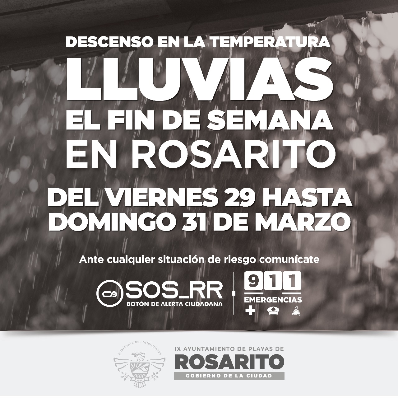 Playas de Rosarito, B.C. 28 de marzo de 2024 El Gobierno Municipal informa que, de acuerdo a los datos del Servicio Metrológico Nacional (SMN), se pronostican lluvias para este fin de semana, con precipitaciones de hasta cuatro pulgadas en zonas altas y montañosas, con descenso en las temperaturas, por lo que se exhorta a las y los rosaritenses a tomar precauciones para evitar accidentes.