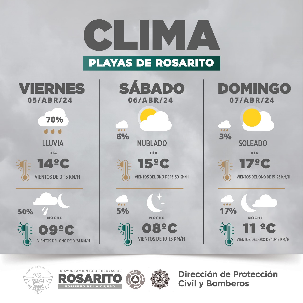 Playas de Rosarito, B.C. a 4 de abril de 2024. La actual administración informa a la comunidad que, de acuerdo al pronóstico del Sistema Meteorológico Nacional (SMN), se esperan lluvias en la región para el viernes 5 de abril, con un descenso en la temperatura de hasta nueve grados centígrados.