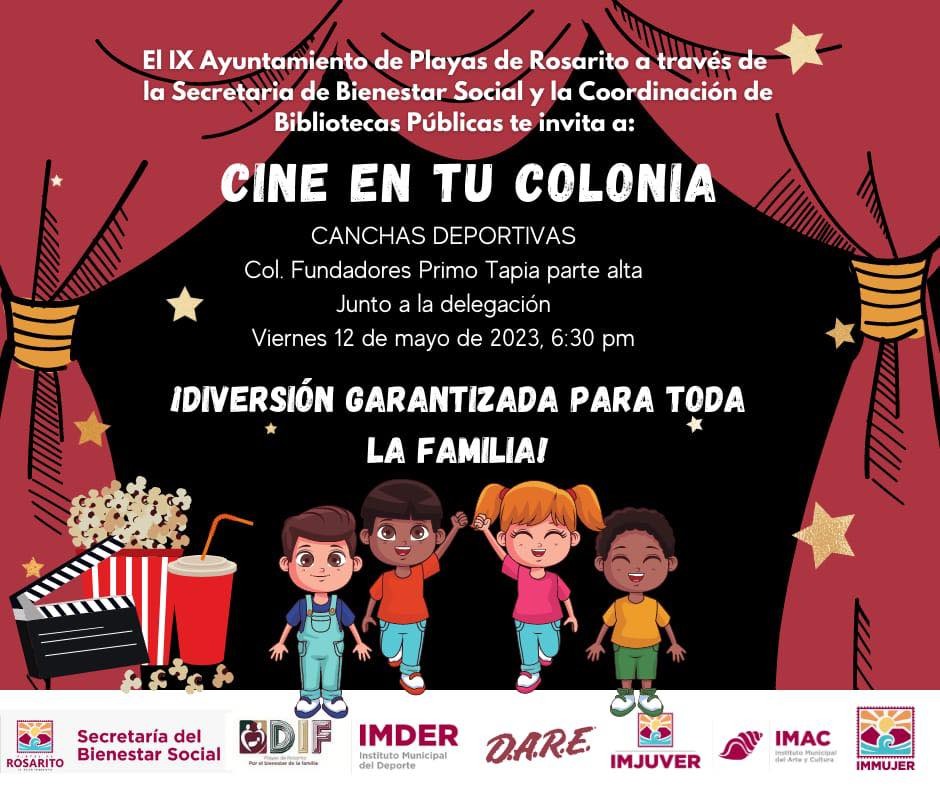Playas de Rosarito, B.C. 10 de mayo de 2023.- Con el objetivo de acercar a los rosaritenses, eventos de entretenimiento y sana convivencia familiar, el Gobierno de la Ciudad, los invita al evento ‘Cine en tu Colonia’, que se llevará a cabo el viernes 12 de mayo a las 18:30 horas en las canchas deportivas de la colonia Fundadores de Primo Tapia Parte Alta.
