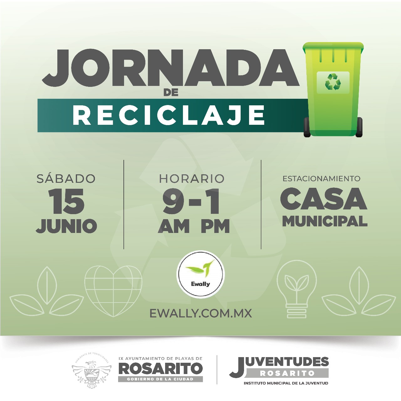 Playas de Rosarito, Baja California, B.C. 28 de mayo de 2024.- El Gobierno Municipal a través del Instituto Municipal de la Juventud (Imjuver) invita a la comunidad a participar en la jornada de reciclaje, el próximo sábado 15 de junio de 2024, de las 9:00 a 13:00 horas, en el estacionamiento de la Casa Municipal.