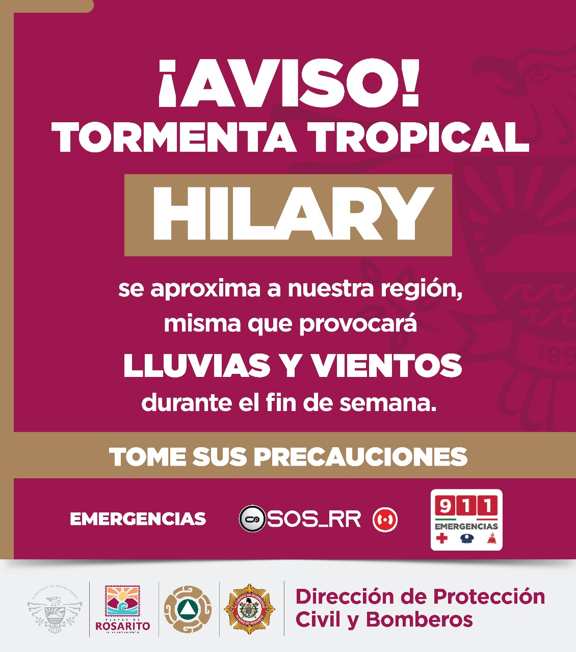 Playas de Rosarito, B.C. 16 de agosto de 2023.- La Dirección de Protección Civil y Bomberos del IX Ayuntamiento de Playas de Rosarito, informa a la comunidad que ante la posibilidad que la tormenta Hilary llegue a nuestra entidad, se pronostican lluvias y vientos moderados en nuestro municipio este fin de semana, por lo que se recomienda tomen precauciones para evitar accidentes.