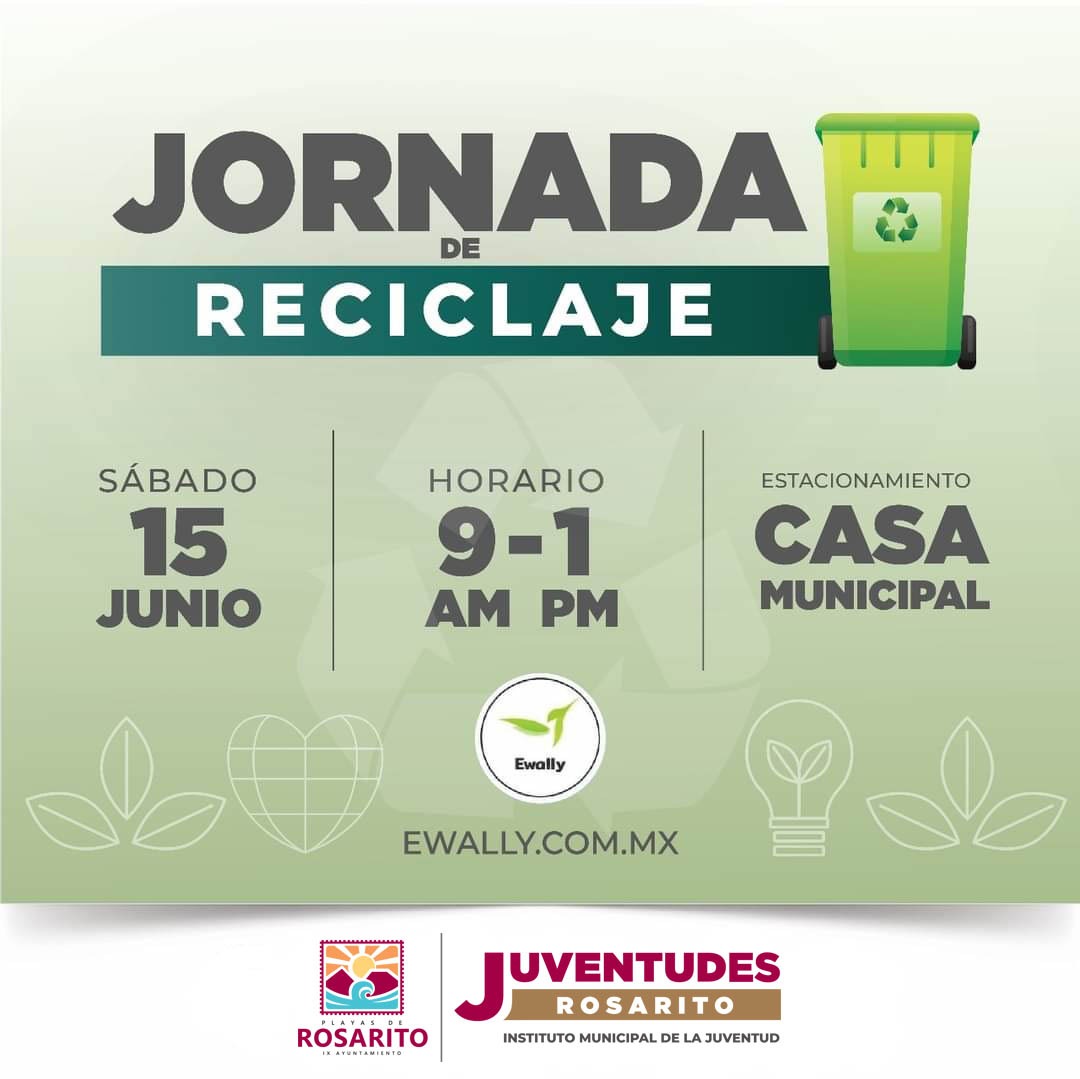 Playas de Rosarito, B.C. 11 de junio de 2024 El Gobierno Municipal que encabeza la presidente municipal, Araceli Brown Figueredo, a través del Instituto Municipal de la Juventud (Imjuver) invita a la comunidad a la Jornada de Reciclaje que se llevará a cabo el próximo sábado 15 de junio de 2024, de 9:00 a 13:00 horas, en el estacionamiento de la Casa Municipal.