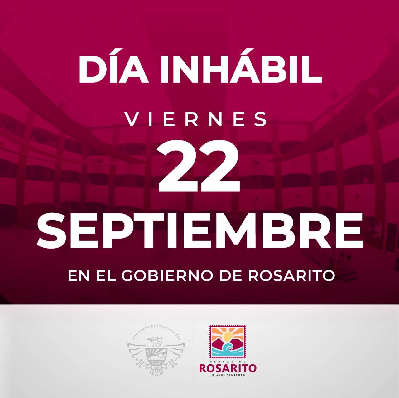 Playas de Rosarito, B.C. 21 de septiembre de 2023.- La alcaldesa Araceli Brown Figueredo informa a la comunidad que el viernes 22 de septiembre será día inhábil para todo el personal de base sindicalizado, base y de confianza que labora en el municipio de Playas de Rosarito, por lo que las áreas de atención al público en la Casa Municipal, delegaciones y paramunicipales permanecerán cerradas.