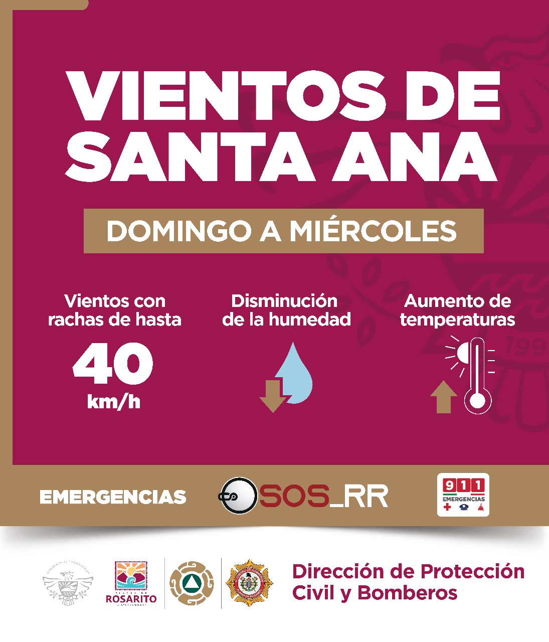 Playas de Rosarito, B.C. 29 de octubre de 2023.- La Dirección de Protección Civil y Bomberos de Playas de Rosarito, informa a la comunidad que se pronostica lleguen a nuestra entidad, vientos moderados de 40 kilometros por hora a partir de la tarde de hoy domingo 29 de octubre y hasta el miércoles 01 de noviembre, por lo que se recomienda tomar precauciones.