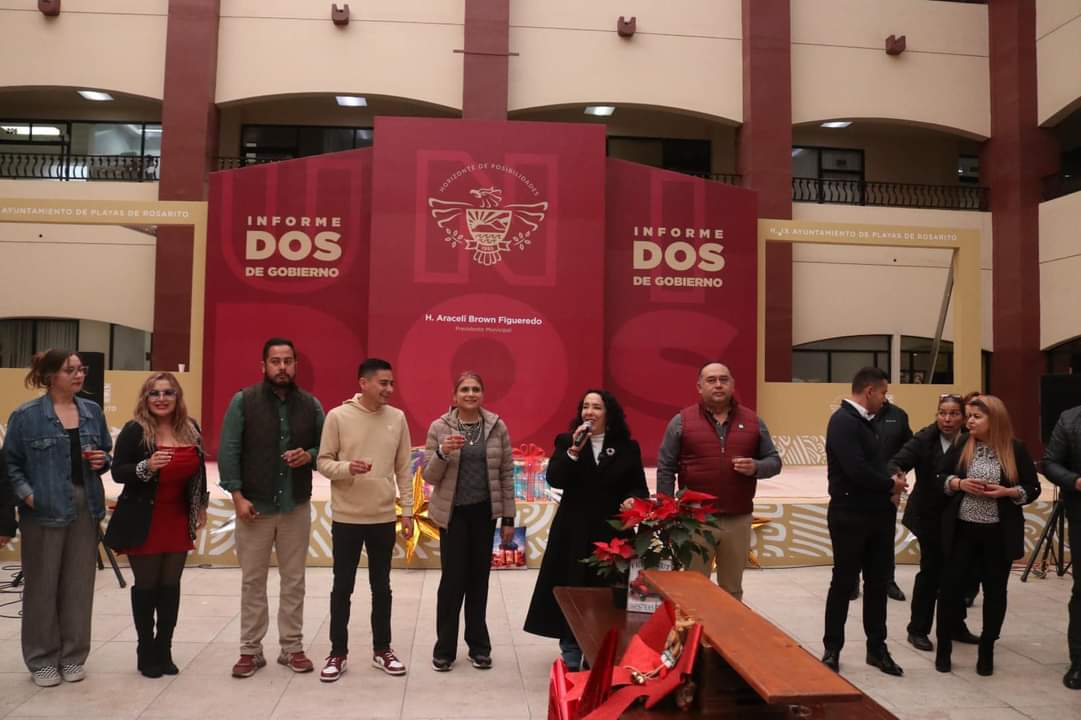 Playas de Rosarito, B.C. 24 de diciembre de 2023.- La presidente municipal, Araceli Brown Figueredo, encabezó el tradicional brindis de Navidad con servidores públicos del IX Ayuntamiento, reconociendo su esfuerzo, labor y sobretodo, compromiso para consolidar la transformación en Playas de Rosarito.