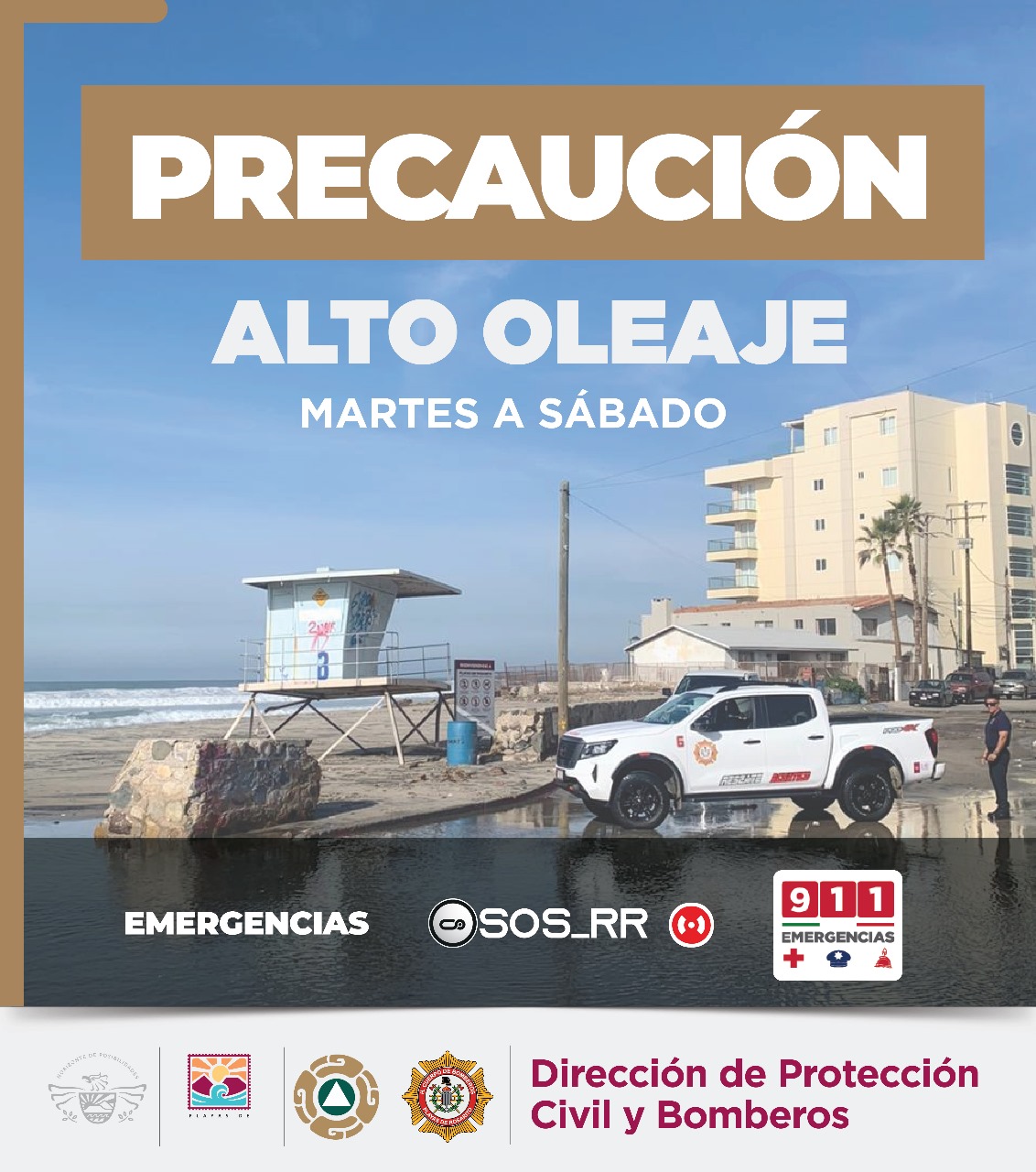 Playas de Rosarito, B.C. 26 de diciembre de 2023.- El Gobierno de la presidente municipal, Araceli Brown Figueredo, informa que a partir de este martes y hasta el sábado 30 de diciembre, se presentará un alto oleaje de cerca de 13 pies de altura en la costas de la localidad, derivado de varios sistemas meteorológicos que afectan al territorio nacional, lo que ocasionará corrientes de arrastre en zonas de mar abierto.