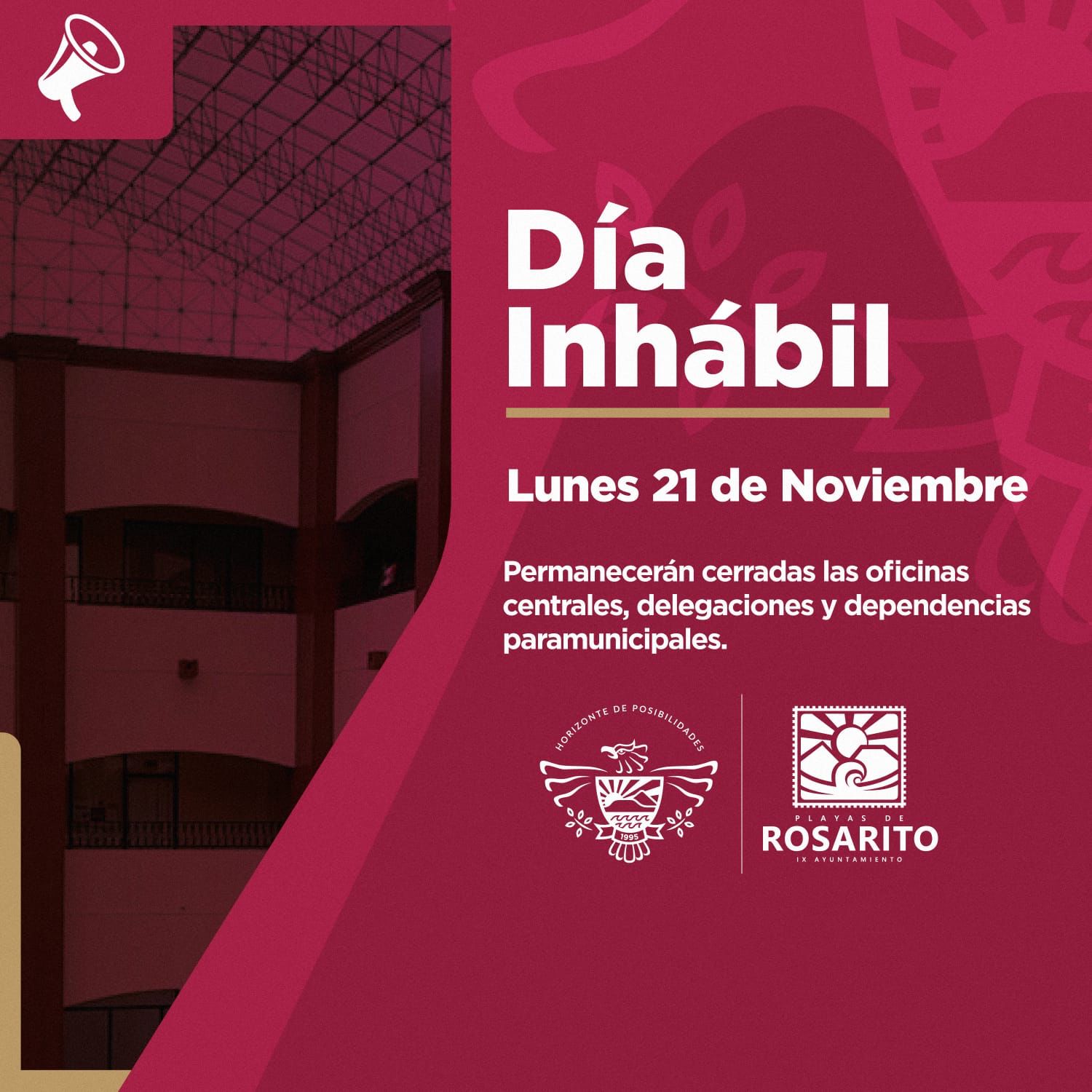 Playas de Rosarito, BC; a 19 de noviembre del 2022.- El IX Ayuntamiento de Playas de Rosarito informa a la ciudadanía que el próximo lunes 21 de noviembre, será día inhábil para el Gobierno Municipal, por lo que permanecerán cerradas las oficinas del gobierno central, delegaciones y paramunicipales.