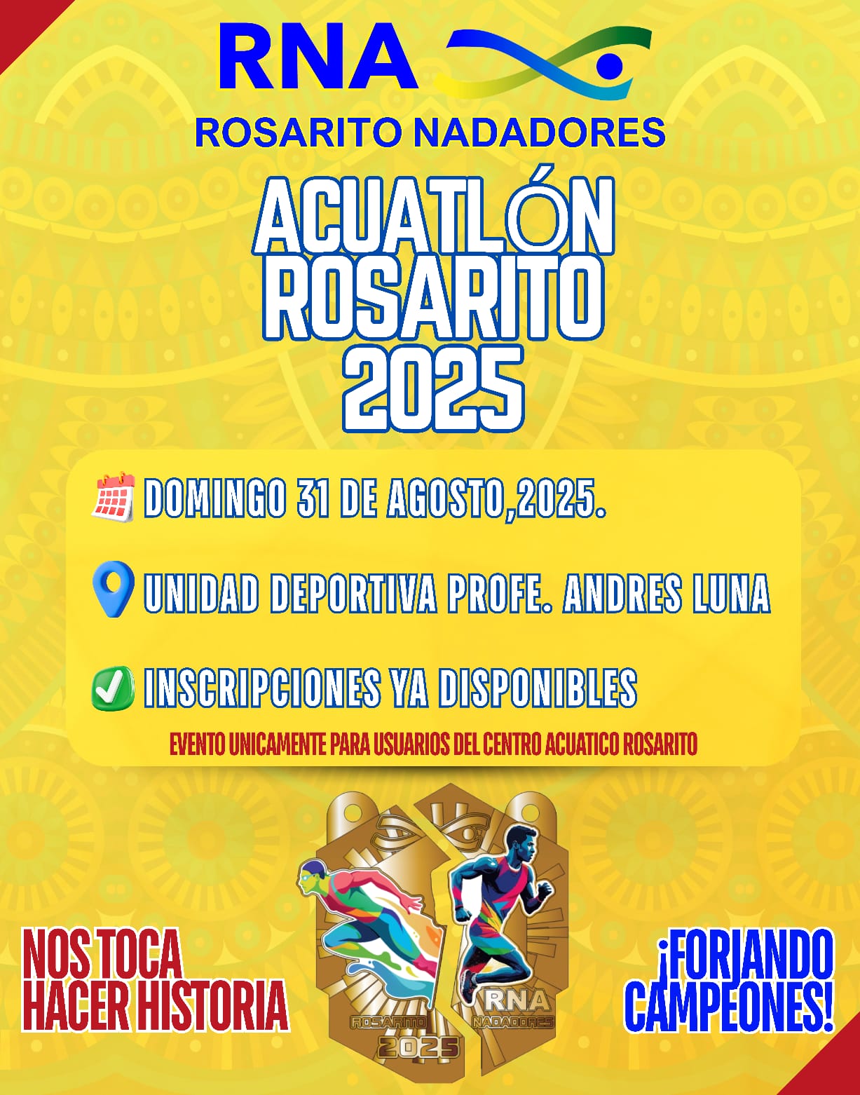 Las inscripciones ya están abiertas en el Centro Acuático Rosarito. Corre por tu lugar y asegura tu medalla. ¡Acompáñanos a escribir juntos un capítulo inolvidable en el deporte de nuestra ciudad!