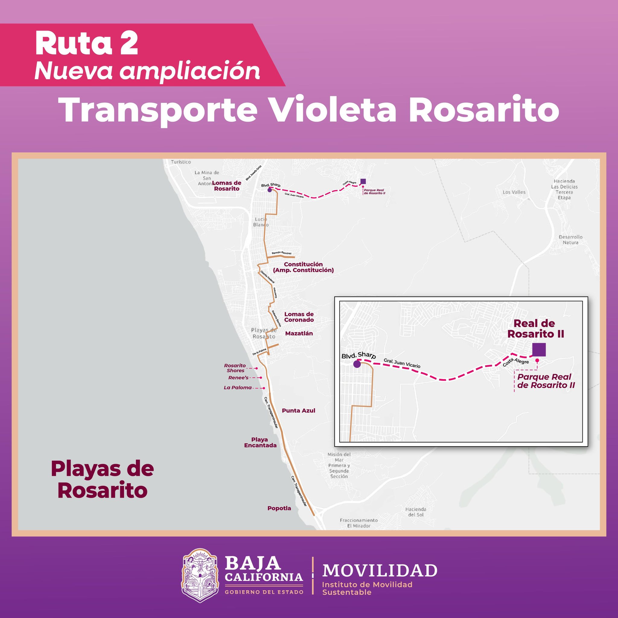 Gracias al apoyo del Gobierno del Estado, la ruta de Transporte Violeta ya llega hasta Real de Rosarito, beneficiando también a las colonias Plan Libertador, Villa Bonita y San Miguel.