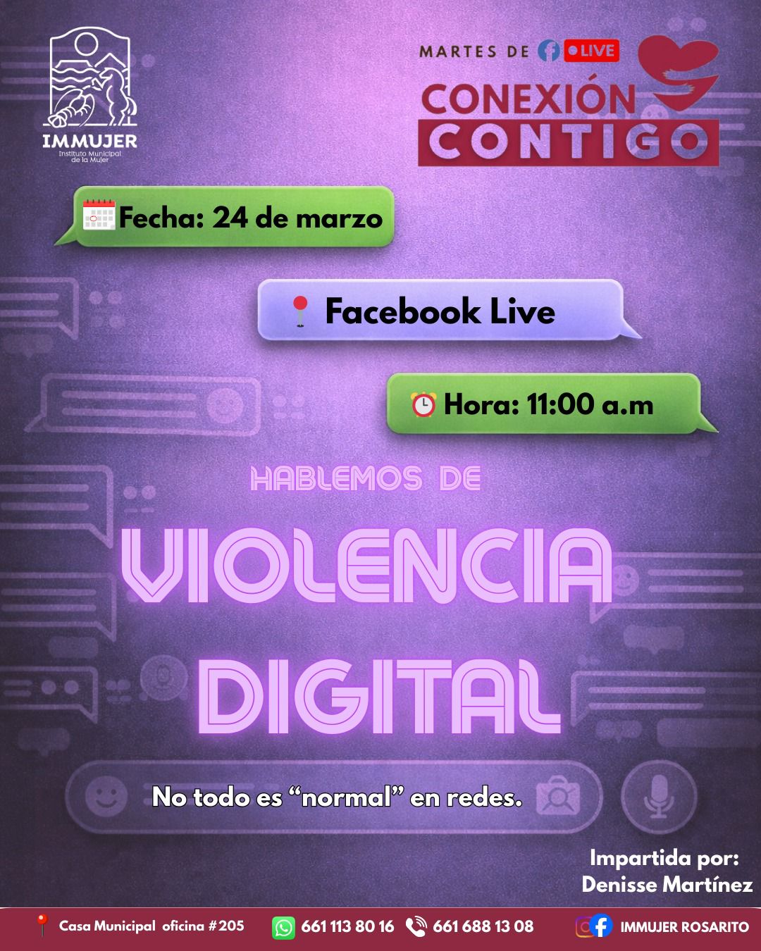 El Instituto Municipal de la Mujer te invita a participar en nuestro próximo Facebook Live, donde hablaremos sobre un tema muy importante: “Hablemos de Violencia Digital”.